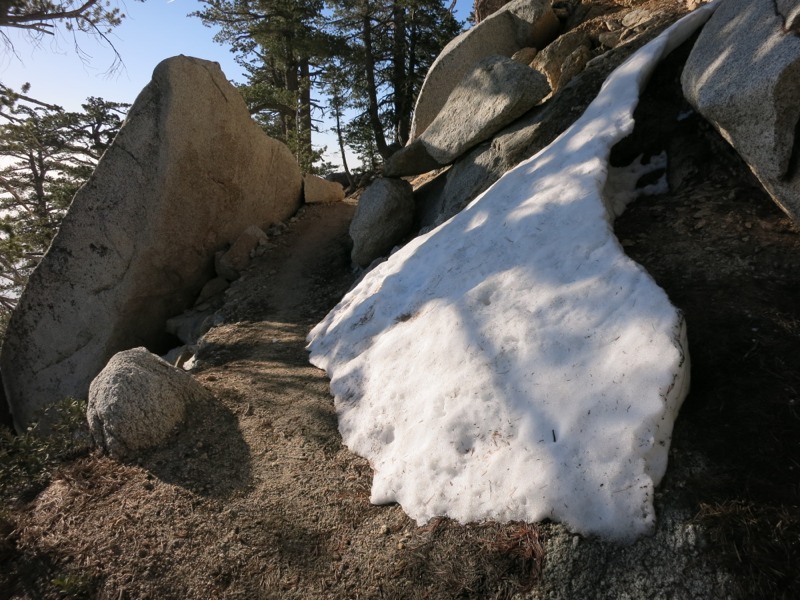 Our first real town stop! On Wednesday we made our sore muscles carry us 4 miles up the trail to Saddle Junction, where we took the Devil’s Slide trail 2.5 miles and 1600 feet down into Idyllwild. Thankfully the PCT stretch was more forgiving than the day before – even in small uphills we were going slowly. Not much gas left in our tanks. We saw our first patches of snow so far.
