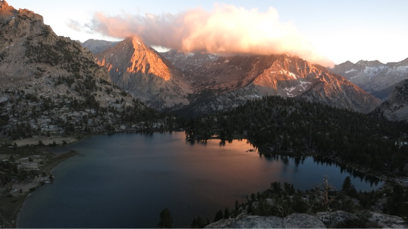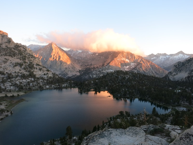 After reaching the pass we started down the other side, taking the Onion Valley trail back to the PCT instead of the Bullfrog Lakes trail. Made it most of the way back before we found a nice campsite in the dusk, out of the wind and overlooking the lakes we passed last Friday. The sunset painted the cliffs, water, and clouds bright pink. We’re sad as always to leave the luxuries of civilization, but thrilled to be back on the trail. We go over Glen Pass tomorrow.