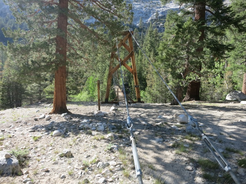 Finally we roused ourselves for the last 5 miles of the day. We descended to Woods Creek, where we chatted with a very nice couple from Australia who are traveling up the west coast. We crossed a suspension bridge over the creek – an actual bridge! It was similar to the two on the Wonderland trail but much shakier, with a few missing planks. We crossed without incident and started uphill towards our campsite and the pass. We followed the creek up its drainage and past all the cascades it made over the rocks. The climb wasn’t bad but we were dragging with no lunch in our bellies. It seemed to take forever to reach the small forest of trees that marked our campsite. We set up right on the edge with the hope that the mosquitos wouldn’t be as bad but I think we didn’t gain much. They have suddenly made an appearance over the last few days now that we’re around a lot more water. They seem to swarm a lot but don’t bite very much – plenty of time for that to change! We are glad to be back in our bags and are anticipating a tough day tomorrow.