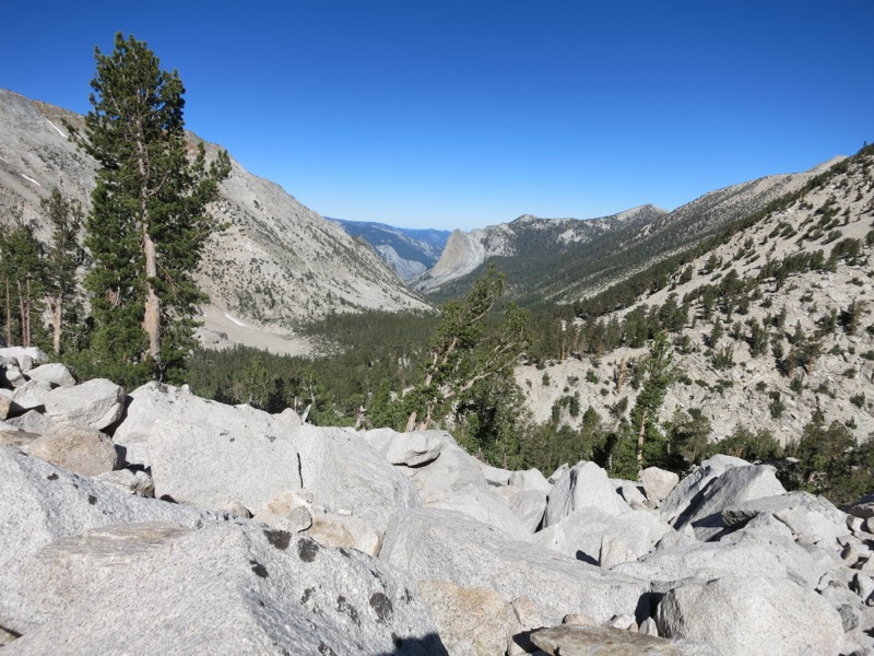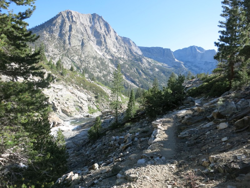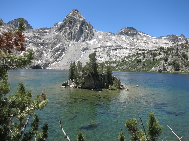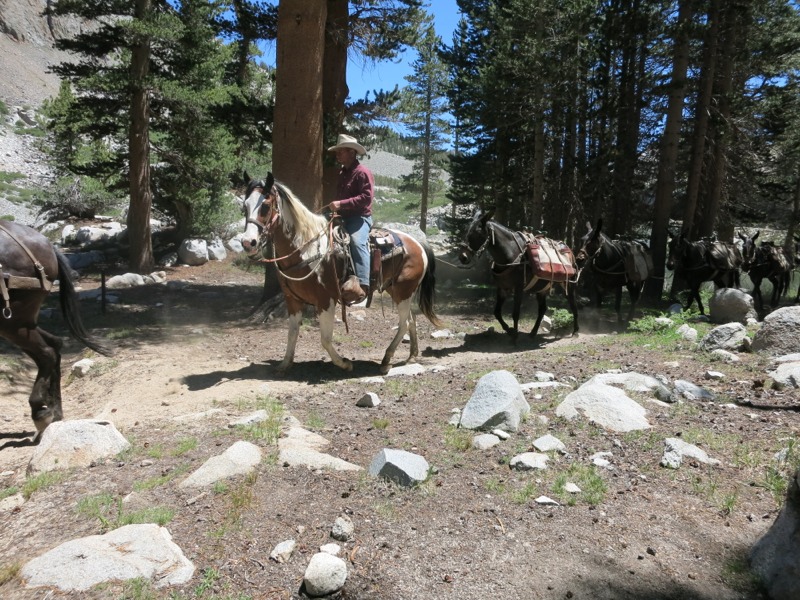 The decent off the pass was dicey at times – steep, rocky, and through intermittent snow – but before long we reached the basin and all the blue-green lakes below. We skirted their shores, watching the trout leap for bugs. On the way down we met a group of backpackers. One of them was wearing a Twins hat and it turned out that he and another guy were from Bloomington and Brooklyn Park! Small world. We all agreed that this was a good summer to miss the baseball season since the Twins were being their usual selves. At Rae Lake near the ranger station we took a quick break before heading on. We were going very slowly and were starting to feel the pinch of time. We had a certain site in mind to stay at tonight in order to hit Pinchot Pass early tomorrow. Along the way we were passed by a NPS mule train – a string of mules hauling supplies, led by two NPS employees on horses. It was neat to see but we ended up dodging manure for the next few hours. Leave no trace, indeed.