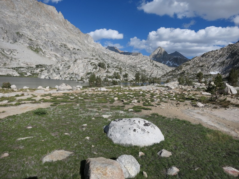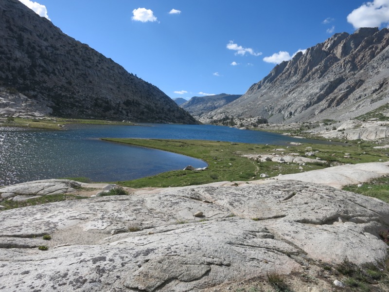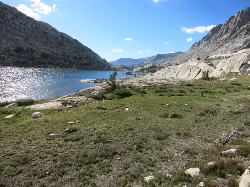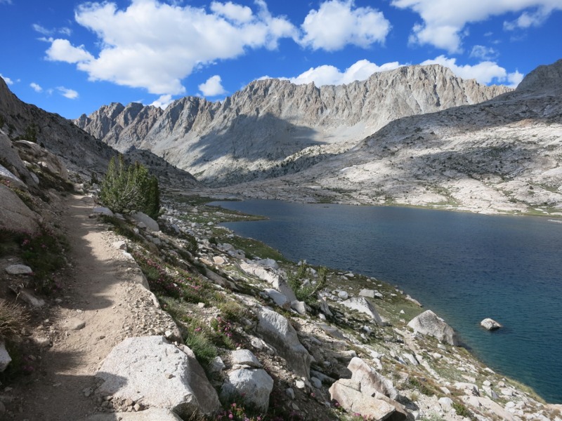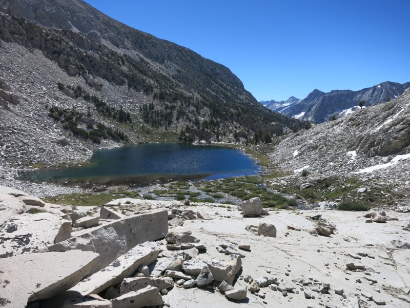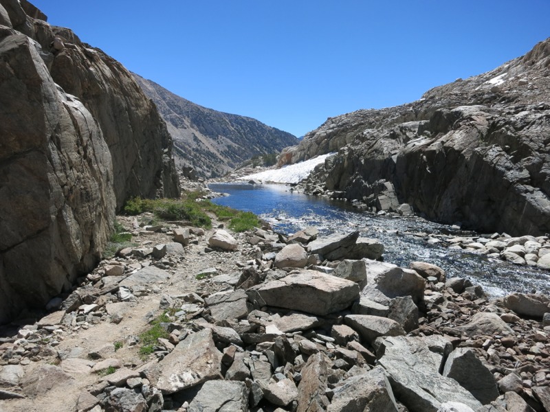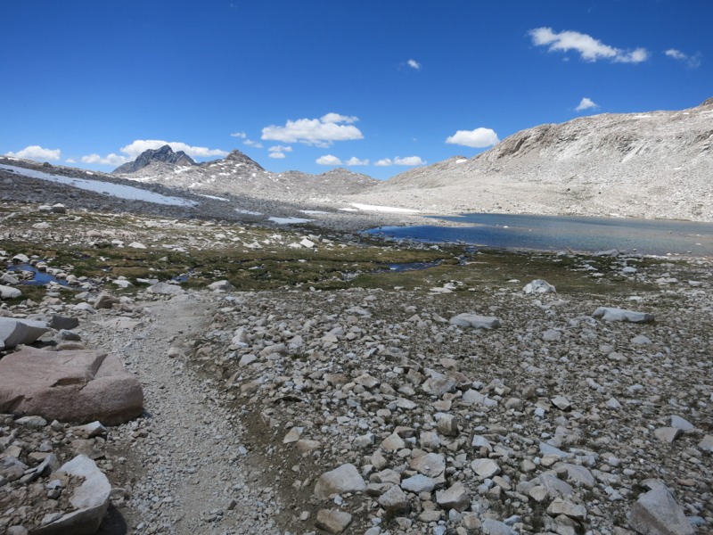 Finally we started down the rocky trail on the other side of the pass. Like the approach, this was spread out over much more terrain than the other passes. We crossed snowbanks and splashed through trickles of water as the trail collected the melt runoff. We passed by Wanda Lake, named for Muir’s daughter (as was Helen Lake on the other side of the pass) and stopped at the headwaters of Evolution Creek. We would stay within earshot of the creek for most of the rest of the day. We stopped here for lunch and took our time, not wanting to rush through such beautiful scenery.