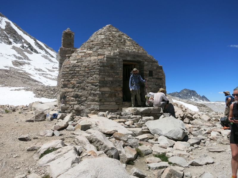 As we got above treeline we started to feel hopeful that we were nearly there, but we were fooled by Muir’s many false summits. Often we would top a ridge to find a lake instead of the stone hut that marks the top. This was very different from the other passes, where the final ascent was obvious from the steep switchbacks – most of the climb was still steep but stretched over miles of trail up the canyon. I can’t imagine what this climb is like during a normal snow year and how people find their way. Finally we headed up one last set of switchbacks to see a stone roof and chimney and we knew we were there at last.