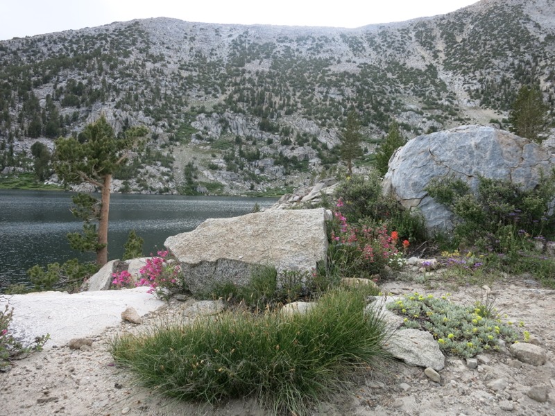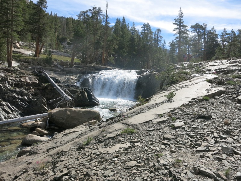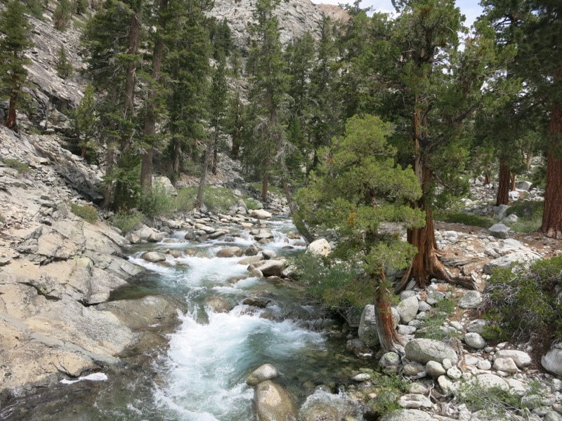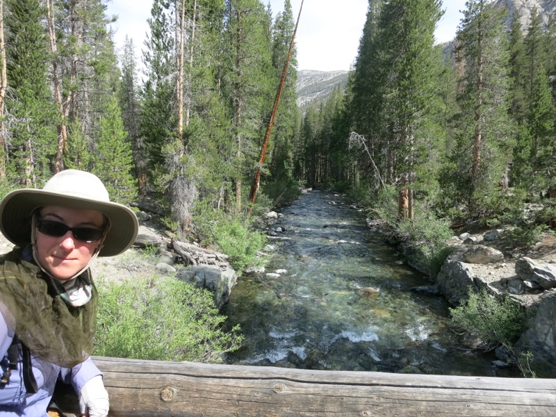 The bugs were still hanging around this morning, but thanks to our net tent we were able to eat and pack up in comfort. We bundled up in our bug gear to take down the tent and ground cloth and were on our way without getting bitten up too badly. Right away we met a group of hikers crossing the stream and one of them had the news that someone had found my glasses. I’m not sure how the rumor made its way up the trail since the hiker that has them is still a day or two behind us, but it made my morning. Now I don’t have to spend lots of money on a new pair in Mammoth.