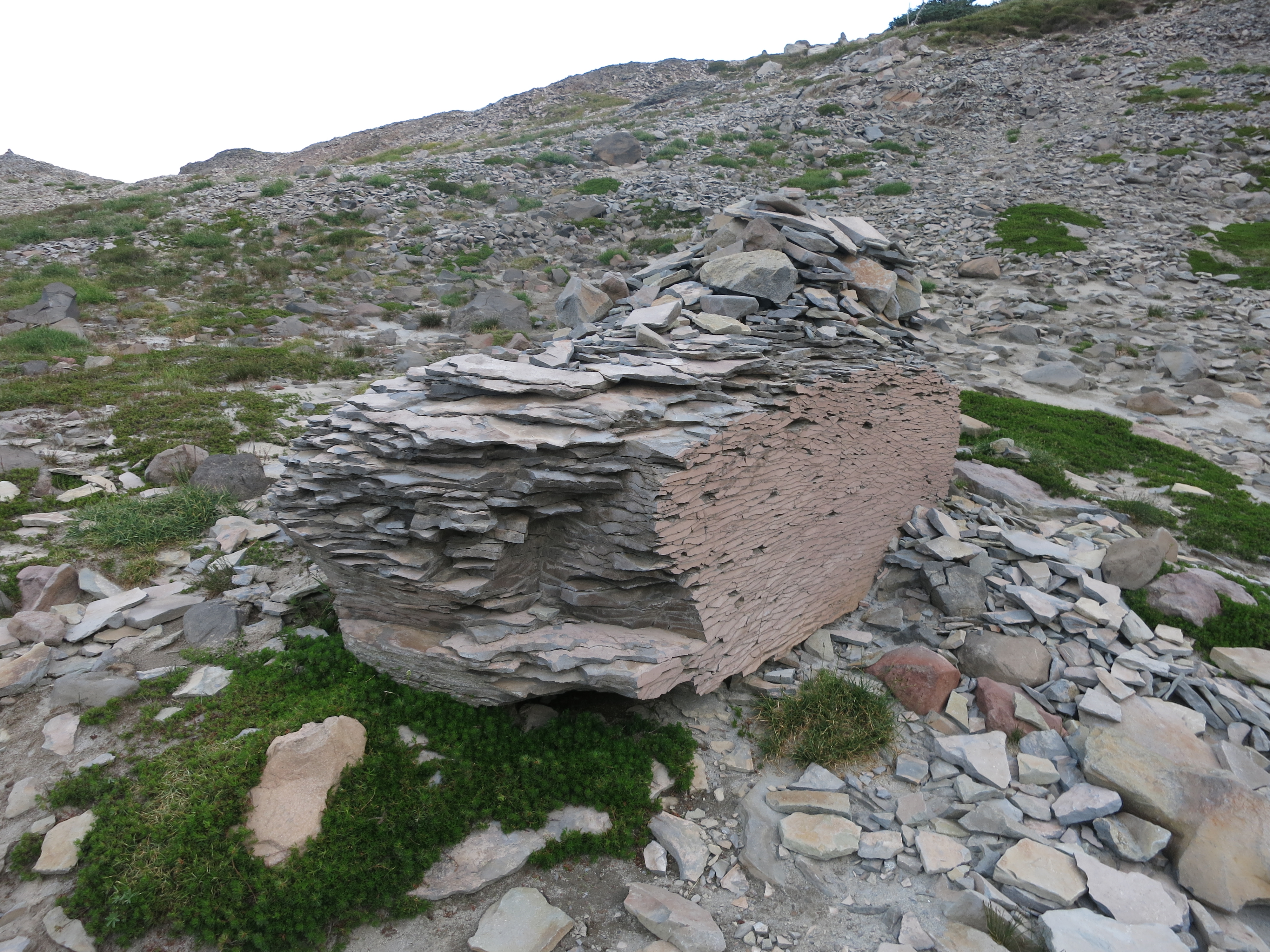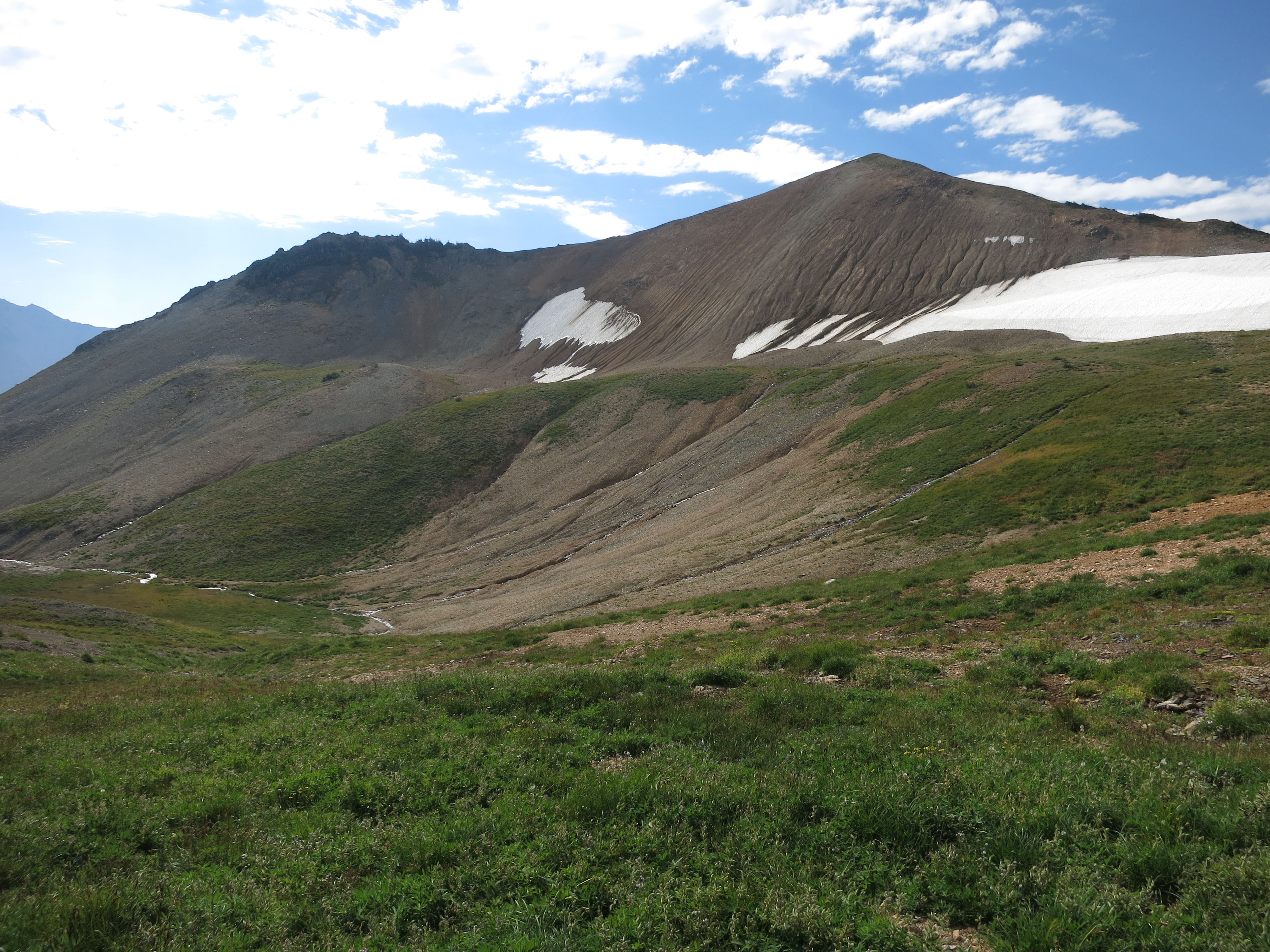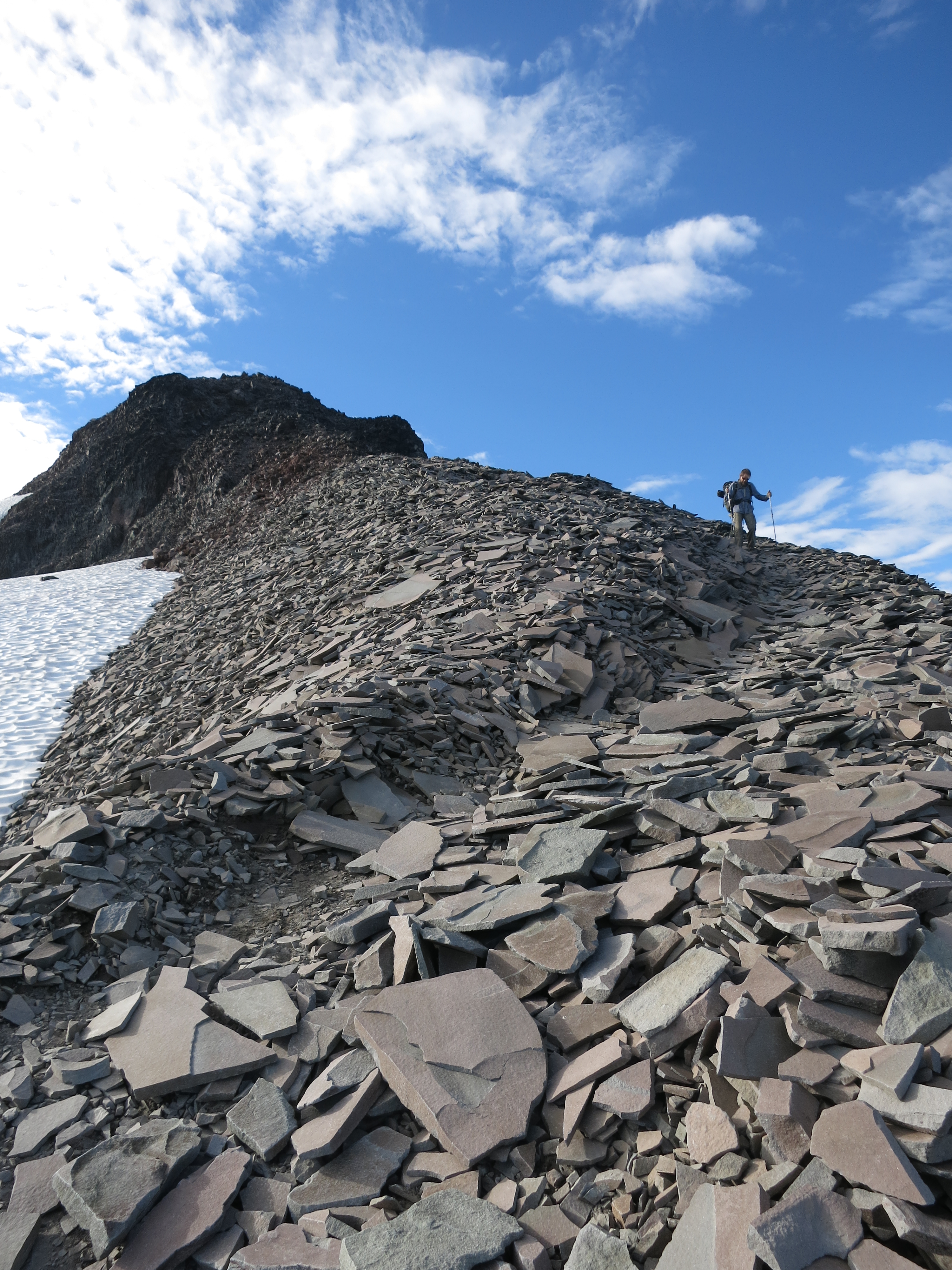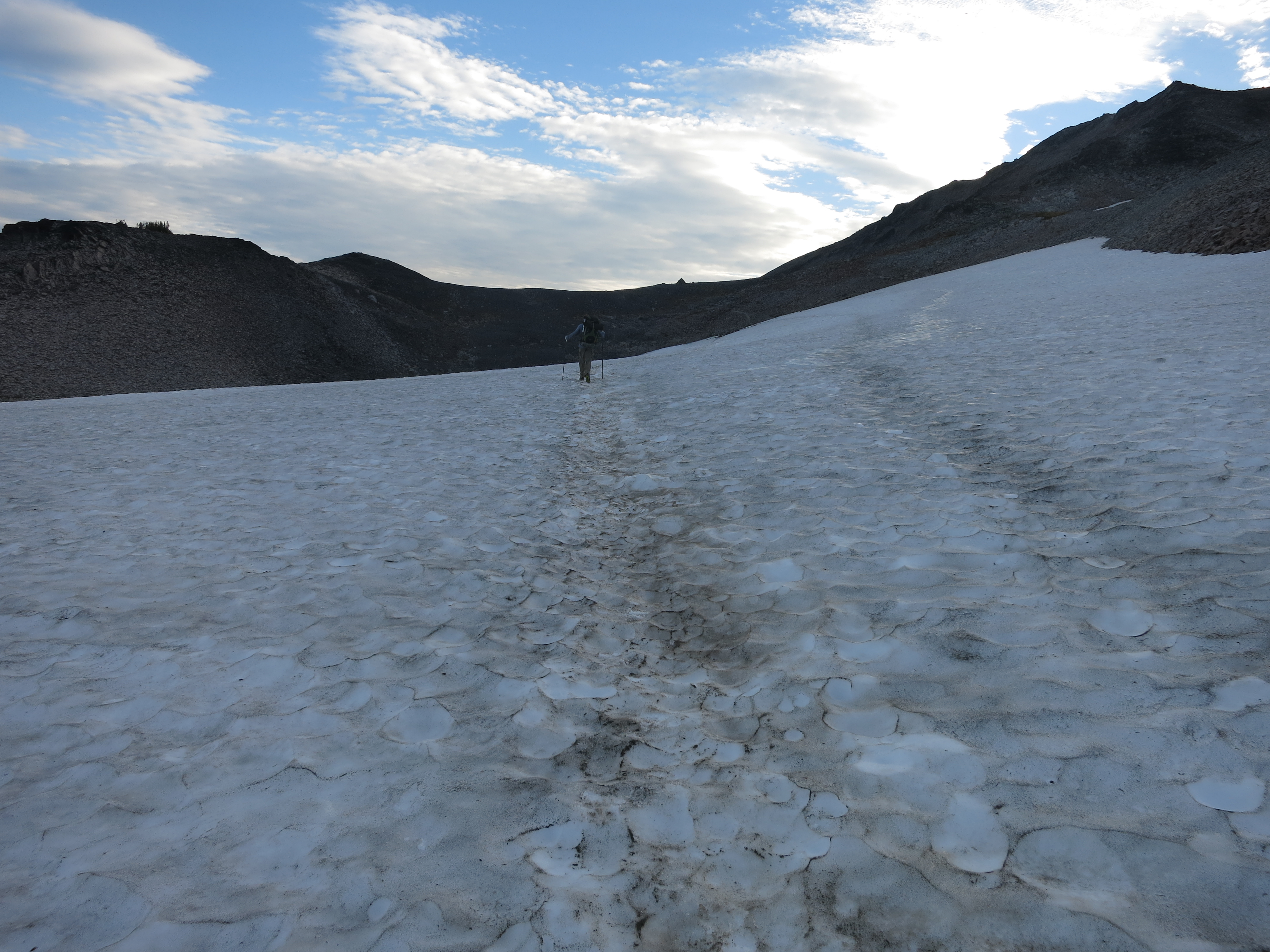 We climbed steeply towards Old Snowy Mountain, traversing a large snowfield and filling our shoes with mud as we mucked through the surprisingly soft till at its edges.