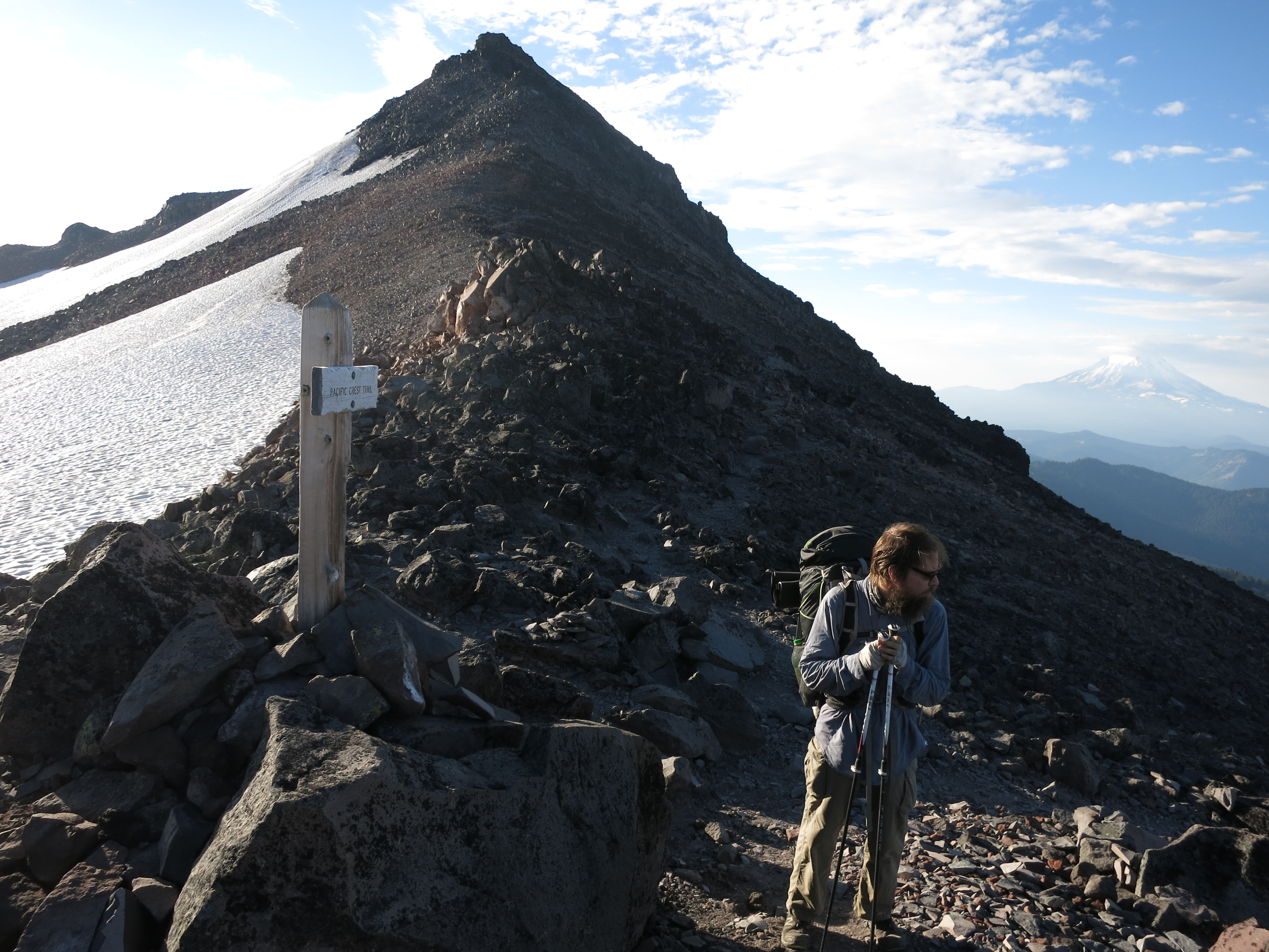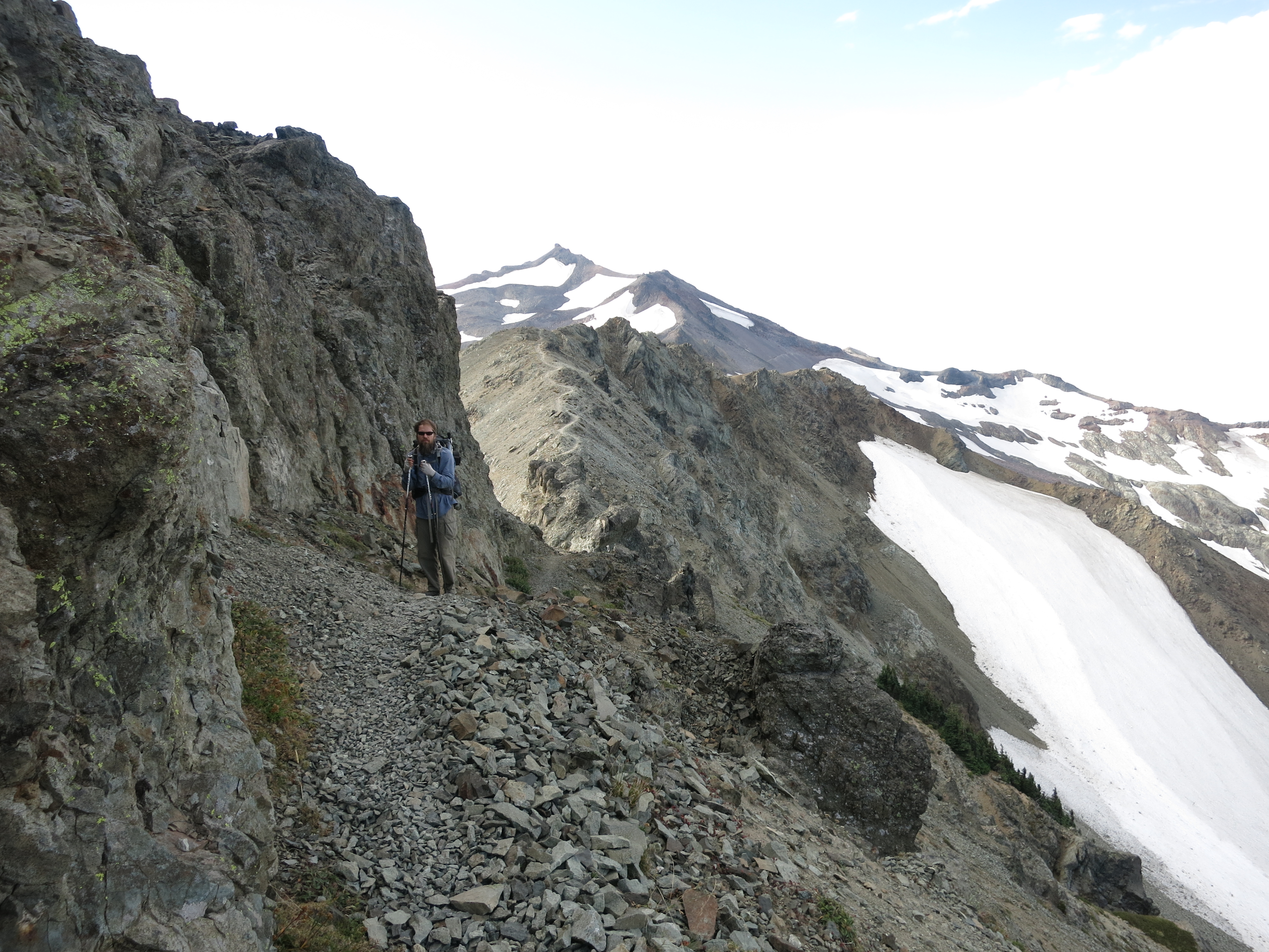 We started off across the rocky landscape, quickly passing the last few trees as we hiked above the treeline. Our first obstacle today was one of the most scenic and photographed stretches of the entire PCT – the Knife’s Edge, a narrow and rugged ridgetop that took us above the Packwood Glacier.